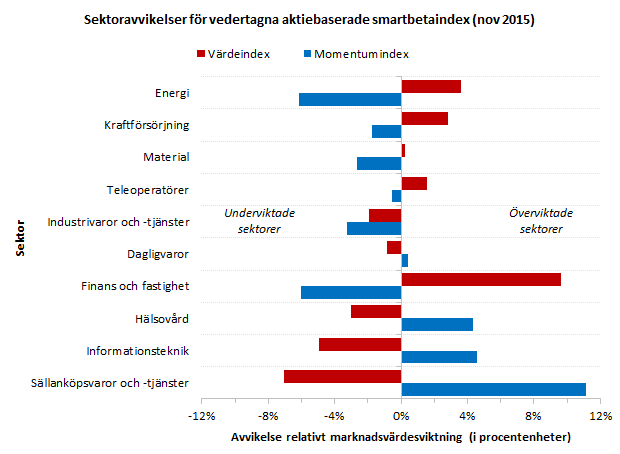 De olika indexkonstruktionsteknikerna får konsekvenser för indexens struktur. Följande är ett exempel på hur sammansättningen hos två vedertagna (globala) aktiebaserade smartbetaindex (värde- och momentum) skiljer sig åt från ett marknadsvärdesviktat index i termer av sektorindelning idag: