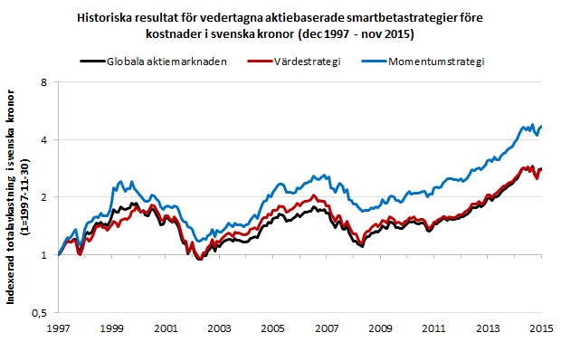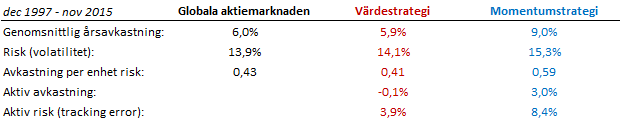 Så, vad blir resultatet av det? Tittar vi på data sen 1997 (vilket vi bör tillägga är ganska kort) så ser vi att en värdestrategi har gått marginellt sämre än marknaden och en momentumstrategi har gått märkbart bättre. Men det viktiga att komma ihåg är att det är historisk data, och om du köper en fond idag så är det inte historien du bryr dig om utan framtiden, hur din fond kommer att gå.