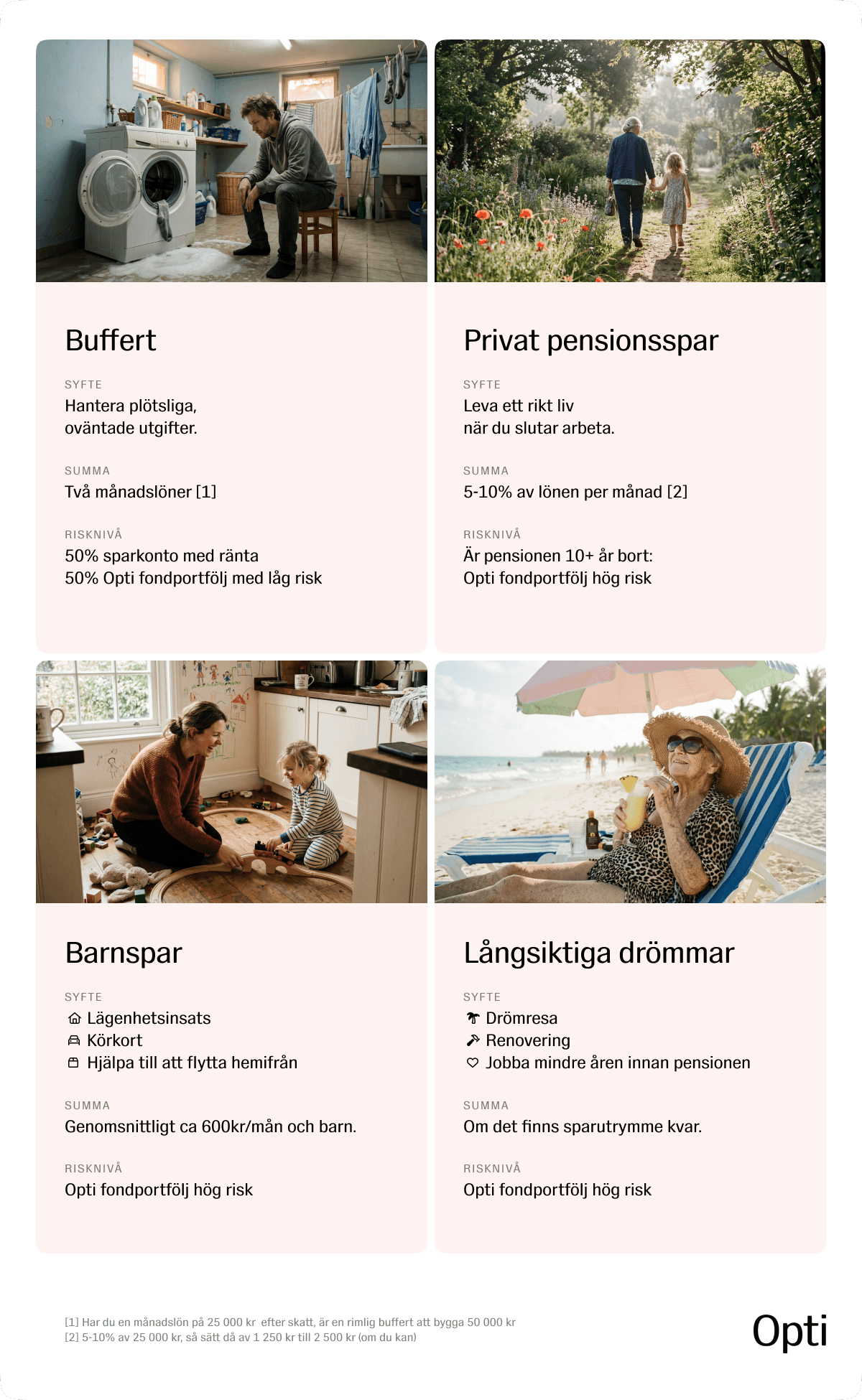 Förvara hälften av din buffert på ett lättillgängligt sparkonto med ränta. Den andra hälften kan du placera i en fondportfölj hos Opti med låg risk, då växer pengarna lite mer än på sparkontot men går ändå enkelt att ta ut om du har behov av att använda dem.