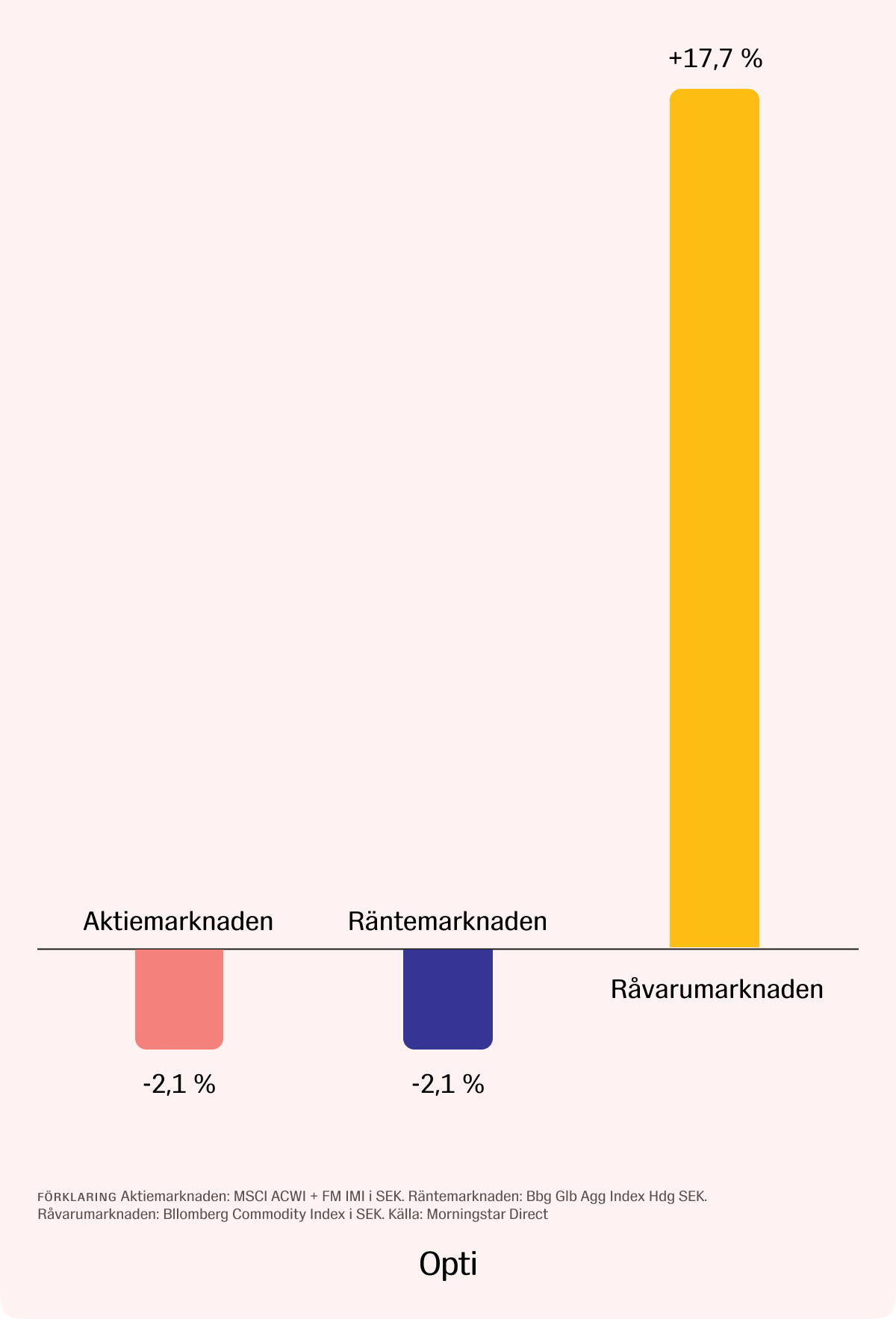 Opti-portföljerna backade men Opti 9 höll emot bättre tack vare större exponering mot råvaror, vars priser steg kraftigt under månaden (+17,7 % mätt som totalavkastningen i kronor för Bloomberg Commodity Index, ett råvaruindex bestående av 25 olika råvaror) och den amerikanska dollarn som stärktes över 5 % mot kronan under månaden.