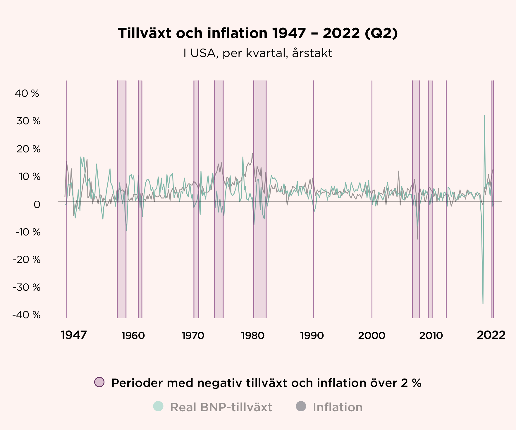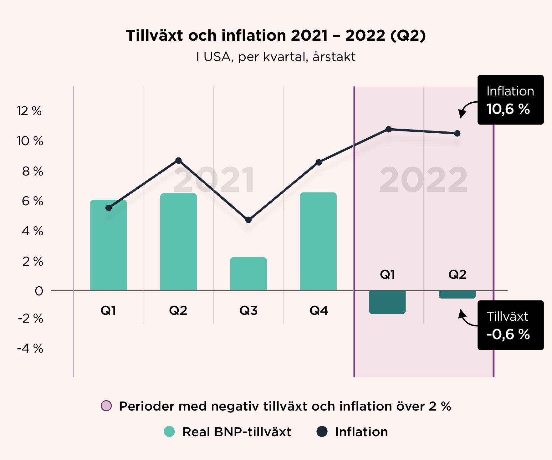Här kan ni se hur inflationen (i USA) ökat de senaste sex kvartalen, samtidigt som tillväxten blivit negativ de senaste två.